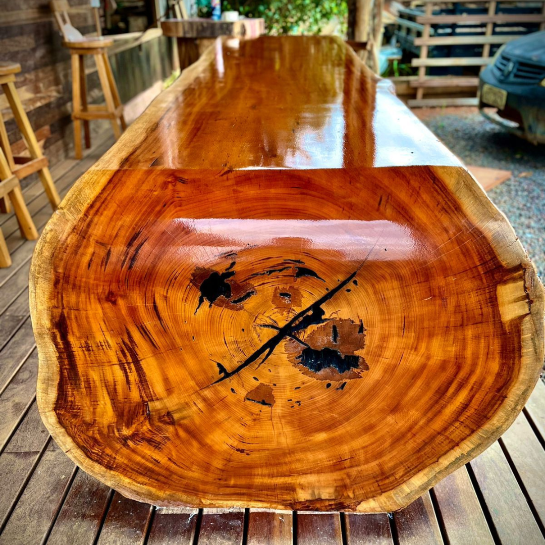 Mesas cascatas esculpidas a partir de tábuas inteiras, com borda natural que preserva o contorno original da madeira. Pés em ferro ou madeira, acabamento com resina ou óleo, criando peça artística e funcional. Produção sob medida, entrega e instalação com cuidado artesanal. Atendimento exclusivo, prazo curto e revisão pós-venda.